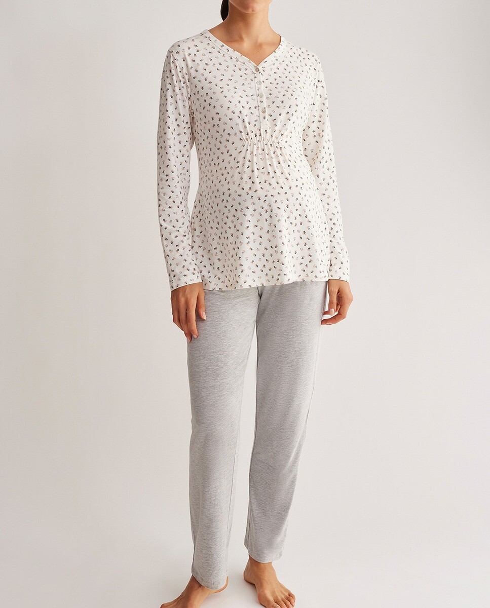 Пижама для беременных с длинными брюками и футболкой с длинными рукавами и разрезом спереди с принтом из модального хлопка.