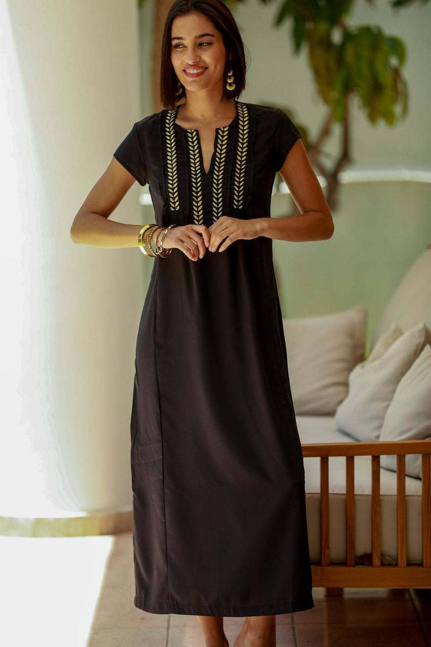 Длинная пляжная туника-платье черного цвета с золотистой вышивкой