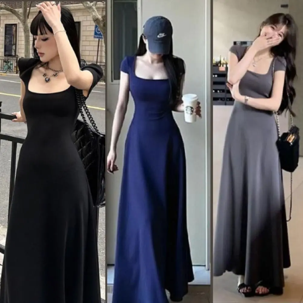 Длинное платье с коротким рукавом, Повседневное платье черного и серого цвета с квадратным вырезом и стразами, женское летнее платье