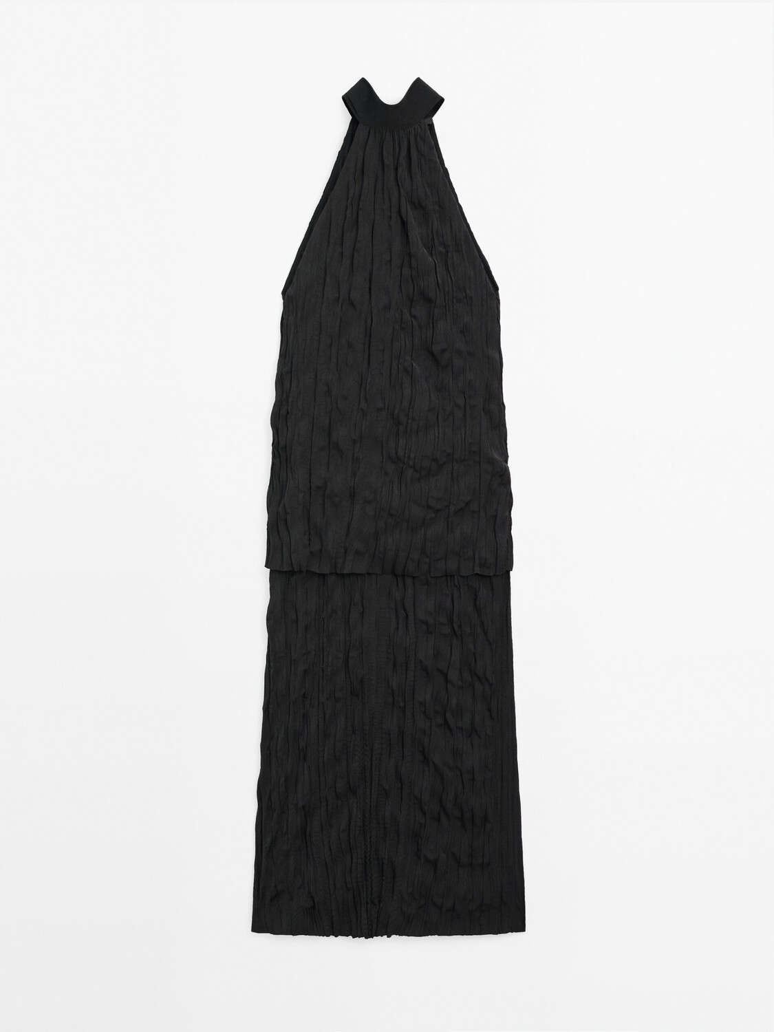 Бренд: Massimo DuttiЦвет: черныйДлинное двухслойное плиссированное платье. Завязка на шее с завязками сзади. Без рукавов. Отделка с эффектом помятости. Это изделие длиннее обычного. Свободный крой.