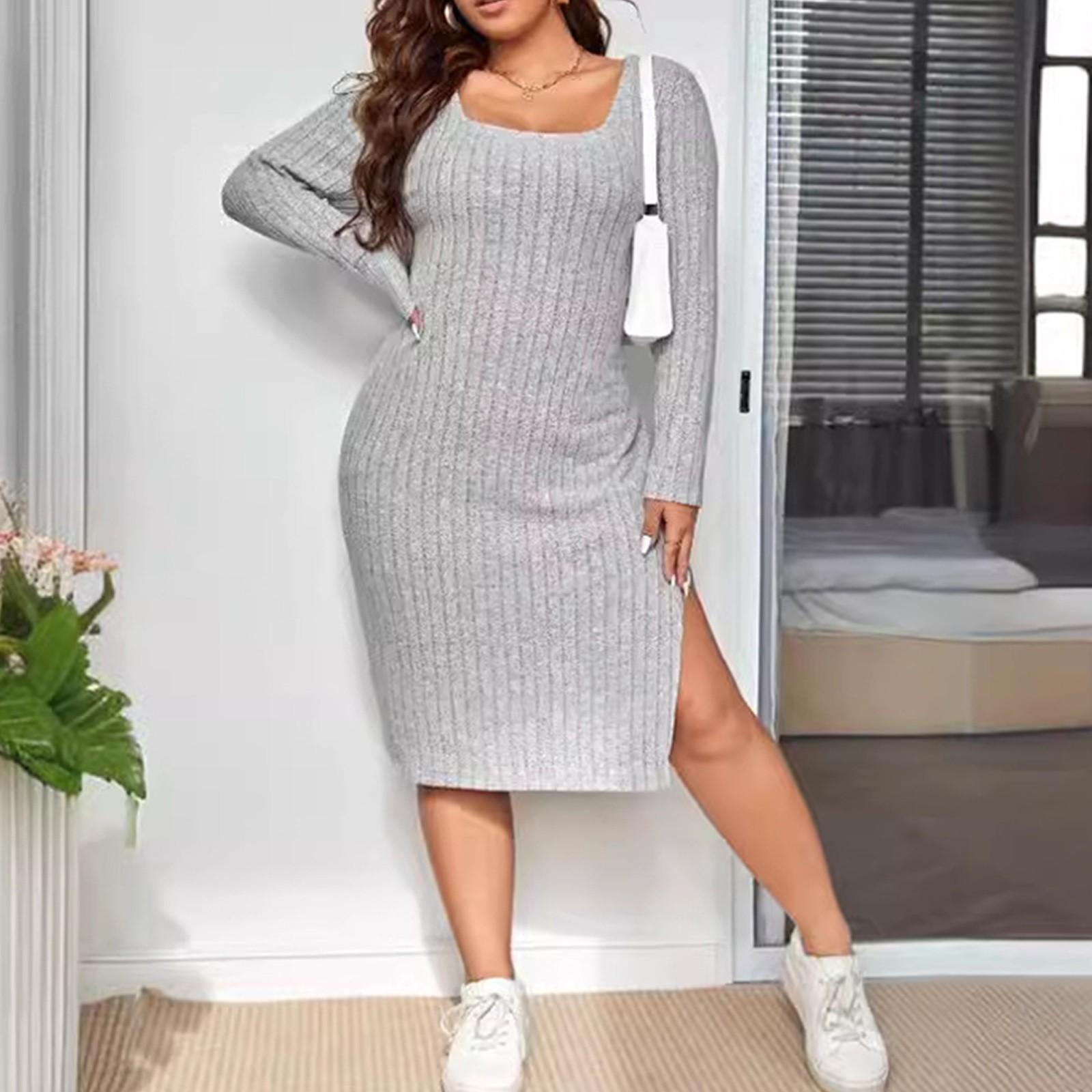 Длинное трикотажное платье большого размера с длинными рукавами и квадратным вырезом для женщин XL светло-серый