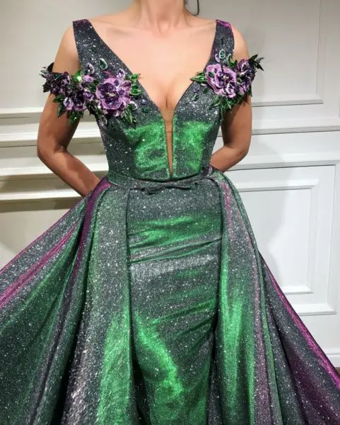 Длинные блестящие платья-русалки с вышивкой и съемным шлейфом, с V-образным вырезом