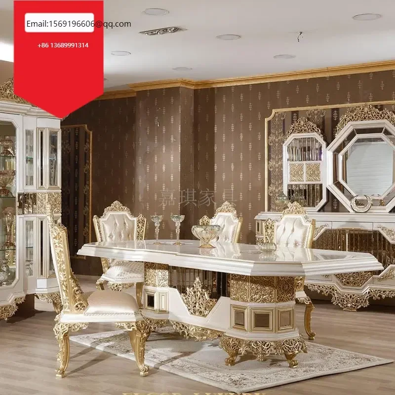 Длинные европейские обеденные столы и стулья под заказ из цельной древесины, роскошная мебель из золотой фольги для французского дворца