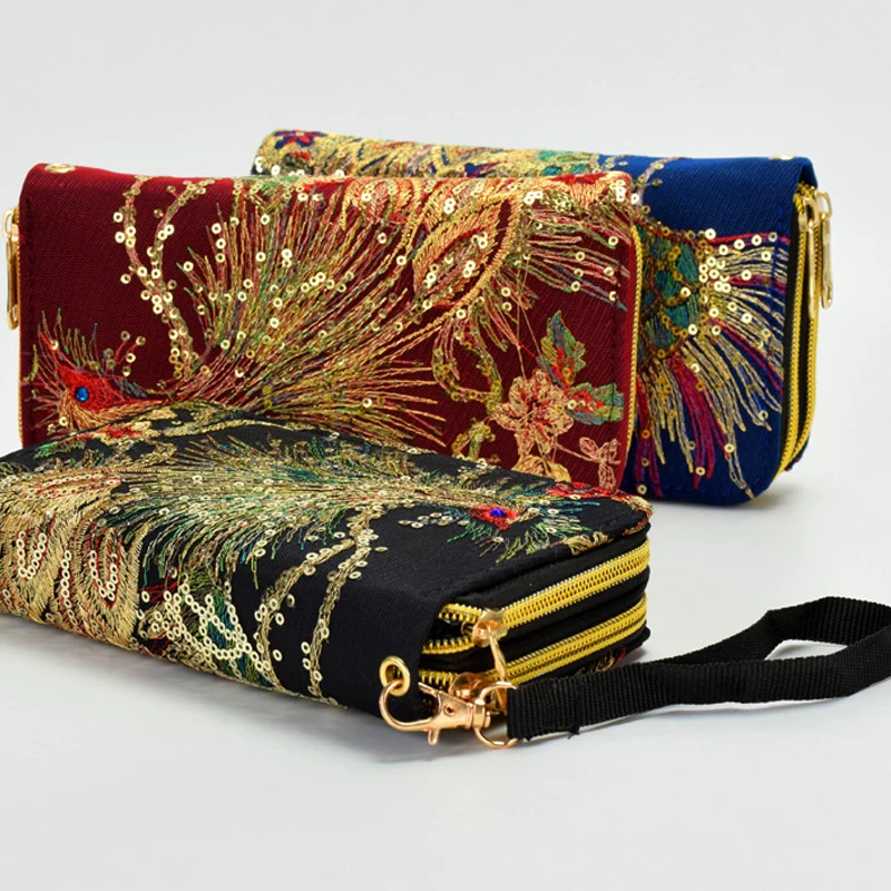 Длинные женские кошельки с вышивкой в виде павлина, Длинный кошелек на двойной молнии, Холщовый кошелек с кармашком для монет, женский клатч...