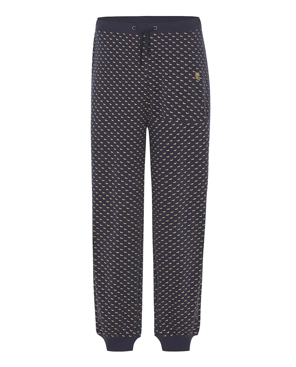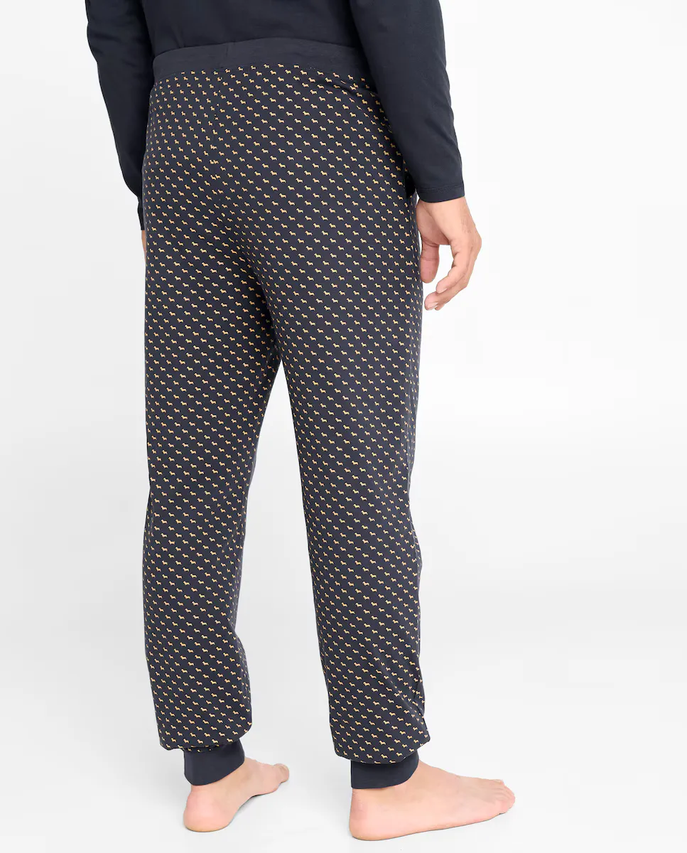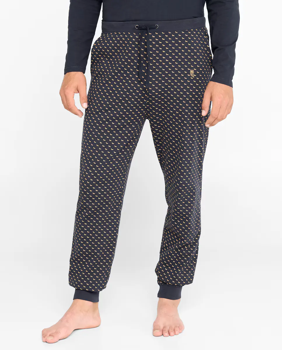 Длинные мужские трикотажные пижамные брюки с коричневым принтом собаки на темно-синем фоне. Essentials Edition, изготовленный из 100% хлопкового трикотажа, обеспечивает мягкость, отличную четкость цвета и стойкость. Обычный крой со свободными штанинами. Брюки приятные на ощупь, очень удобные. Вышитый логотип на ноге коричневого цвета. Эластичный пояс с подходящей лентой, позволяющей лучше регулировать брюки.