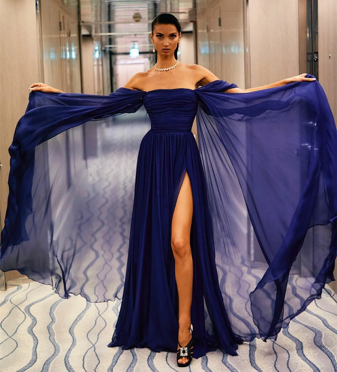 Длинные темно-синие шифоновые вечерние платья а-силуэта с открытыми плечами и Боковым Разрезом на молнии ярко-синие 2023
