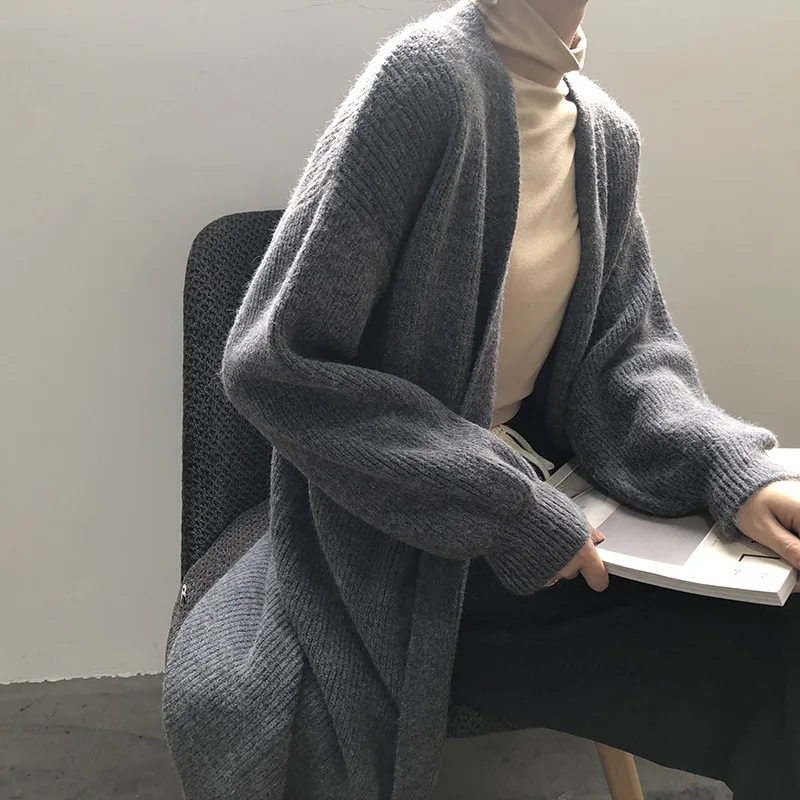 Длинный вязаный кардиган с открытой передней частью, Женское пальто, осень 2023, Корейская Свободная верхняя одежда с напуском, свитер