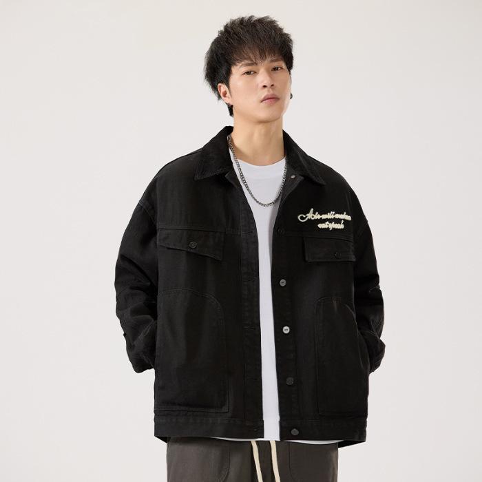 Длинный рукав Сращивание Стирать полотенце Вышивка Дизайн Джинсовая куртка Мужская Американская Ретро Тренд Печать Свободная куртка Мужская 3XL чёрный