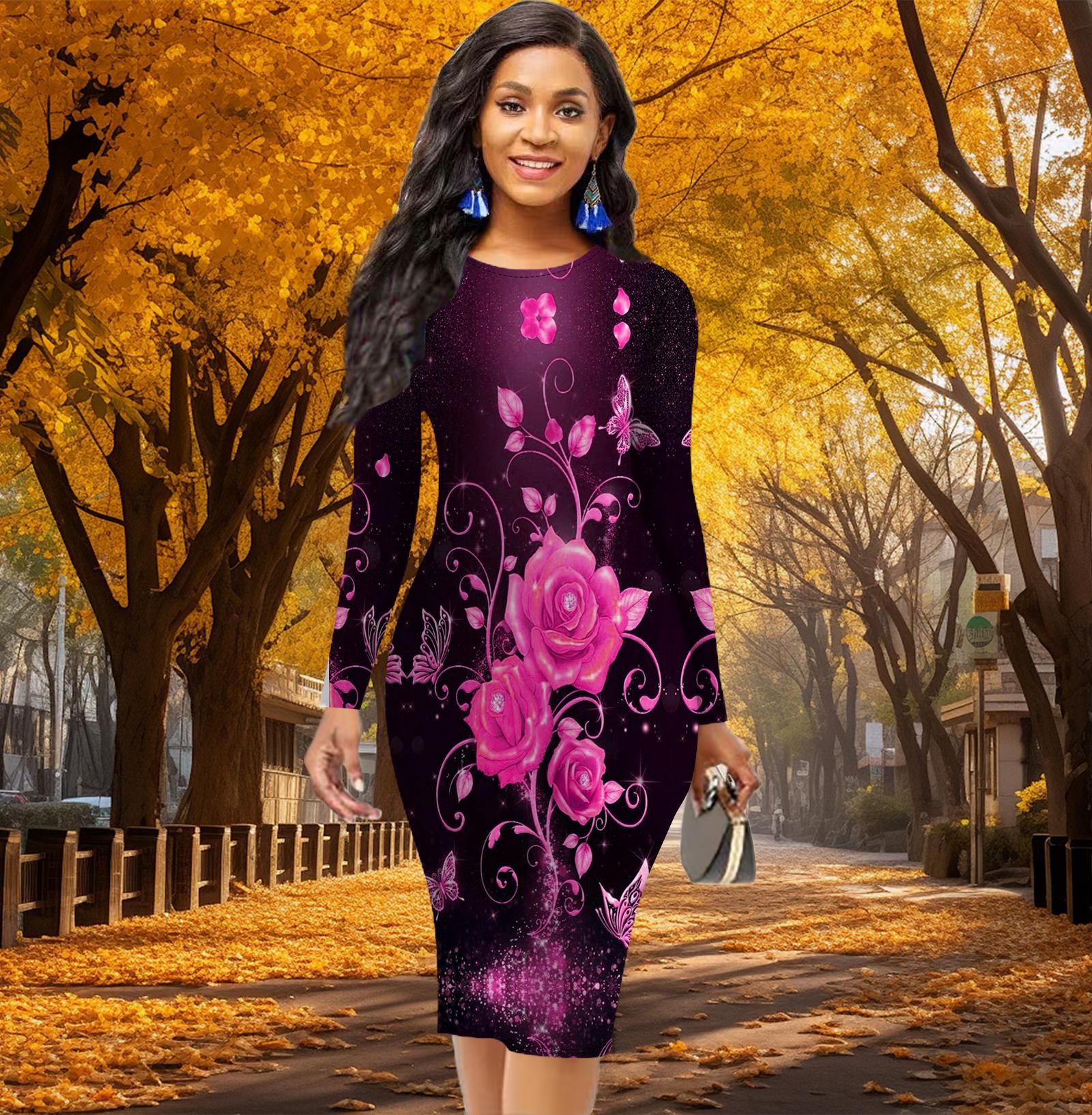 Длинный рукав, облегающее, офисное, облегающее, с принтом роз и бабочек, элегантное облегающее платье XL