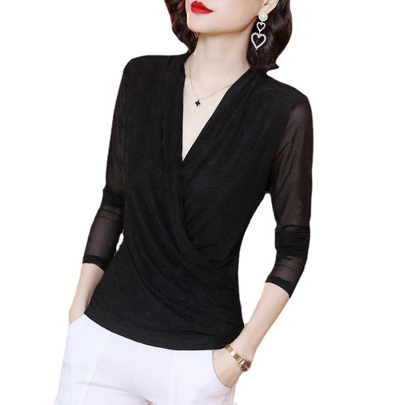 Длинный рукав, перекрестный V-образный вырез, осенняя женская рубашка для мамы, закрывающая живот, футболка с цветочным принтом внизу и верхом 5XL