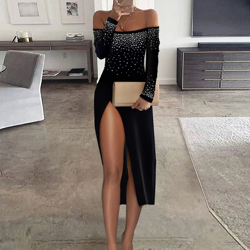 Сексуальное женское вечернее платье с вырезом лодочкой и высоким разрезом на весну и осень, однотонное женское элегантное вечернее платье