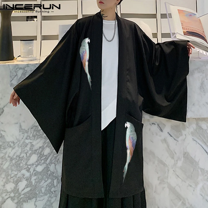 Для мужчин Футболка с принтом с длинными рукавами в уличном стиле с открытым швом; Свободный кардиган кимоно Винтаж карманы 2021 Повседневное...