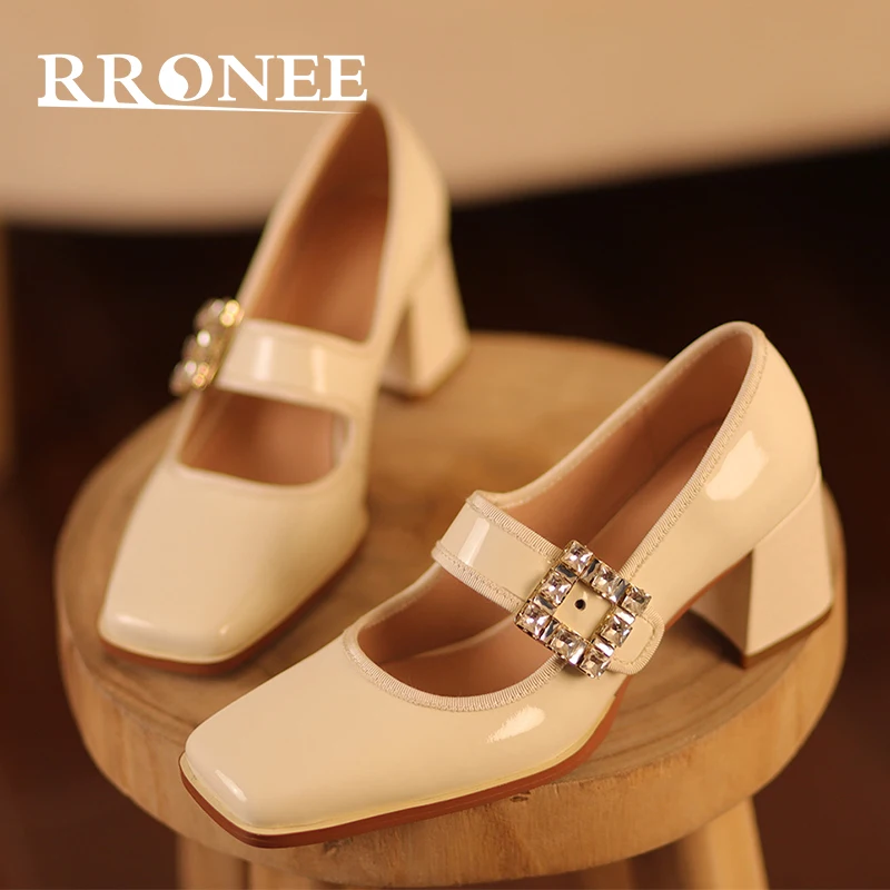 Новинка 2022, Женские Кожаные Туфли Мэри Джейн на среднем каблуке с одним ремешком и квадратным носком, из лакированной кожи, на толстом каблу...