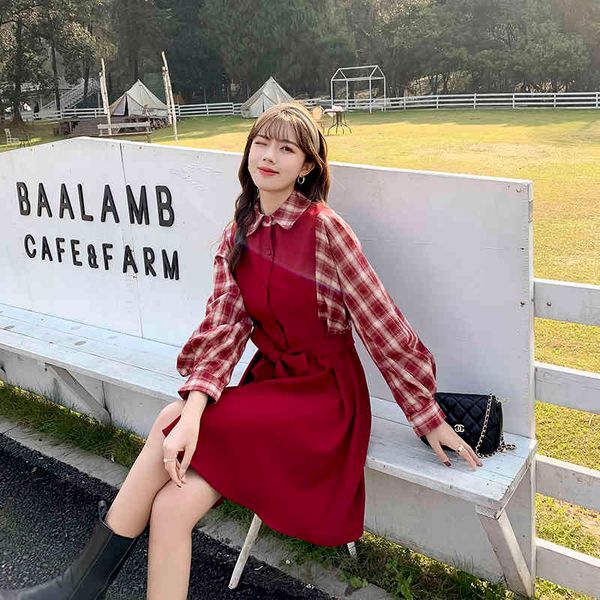dress 2021 spring as woman line sweet red plaid long women's waist high dress, Black;gray