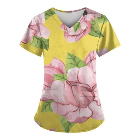 TKing Fashion Independence Day Women Plus Size Scrubs Top V-Neck Short Sleeve Printed Pockets Work Blouse for Women Yellow 2XL
