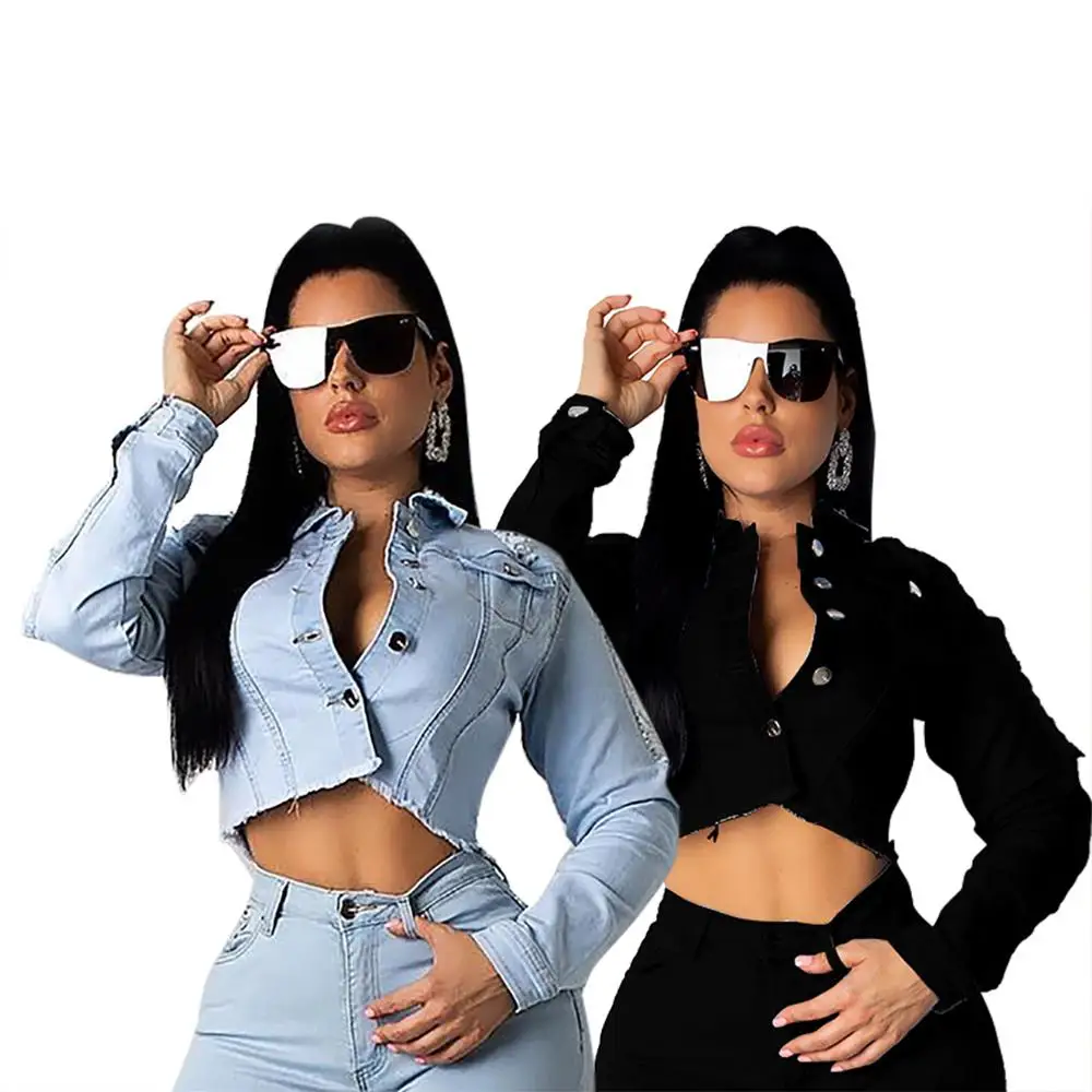 Solid Color Washed Denim Jacket Full Sleeve Turn-Down Collar Open Back Pocket Single-Breasted Casual Fashion Women Coat
