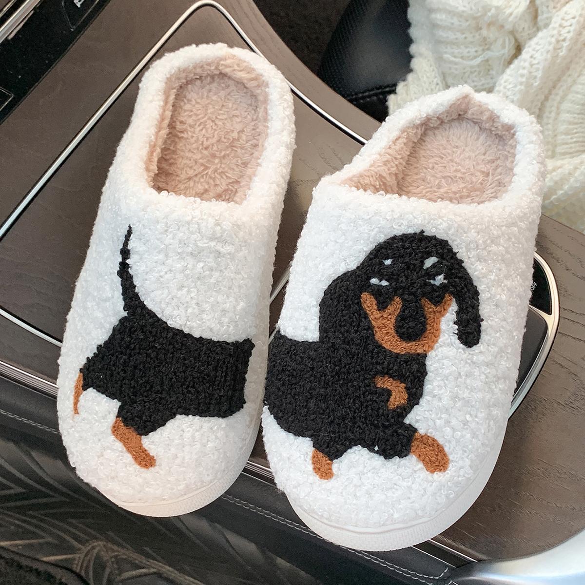 Домашние тапочки с вышивкой таксы, с рисунком питомца, плюшевые, на толстой подошве, в клетку, пушистые, хлопковые, милые, теплые, нескользящие, для помещения, подарок 38-39 чёрный