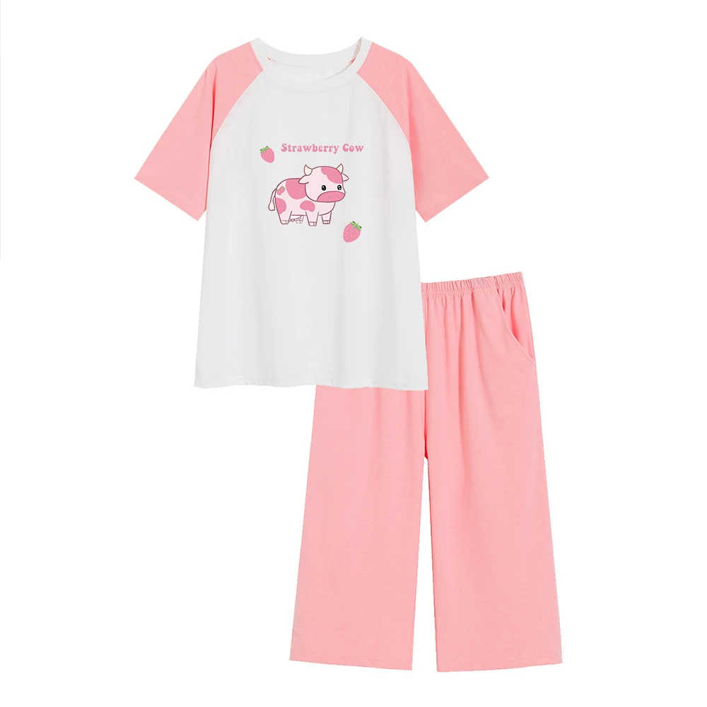 Домашняя одежда Kawaii в виде клубники и коровы, женский модный розовый комплект для сна с принтом, летняя повседневная одежда для сна оверсайз...
