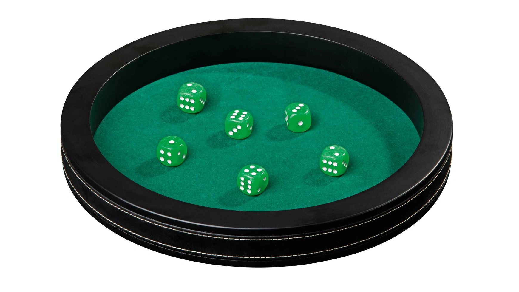 МДФ с манжетой из искусственной кожи, диаметр 350 мм, высота 36 мм, поверхность кубика с фетром, 6 кубиков с перламутровым эффектом, длина края 15 мм.