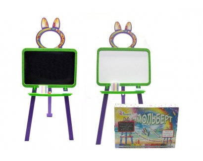 Дитячий мольберт 2 в 1. Плитка, розбірна, універсальна. У комплект входить: 2-х стороння дошка для малювання (1 сторона - біла, малювання маркером; 2 сторона - чорна, малювання крейдою), крейда, маркер, мочалка. Висота мольберта - 110-130 см. Розмір дошки: 47х40 см.