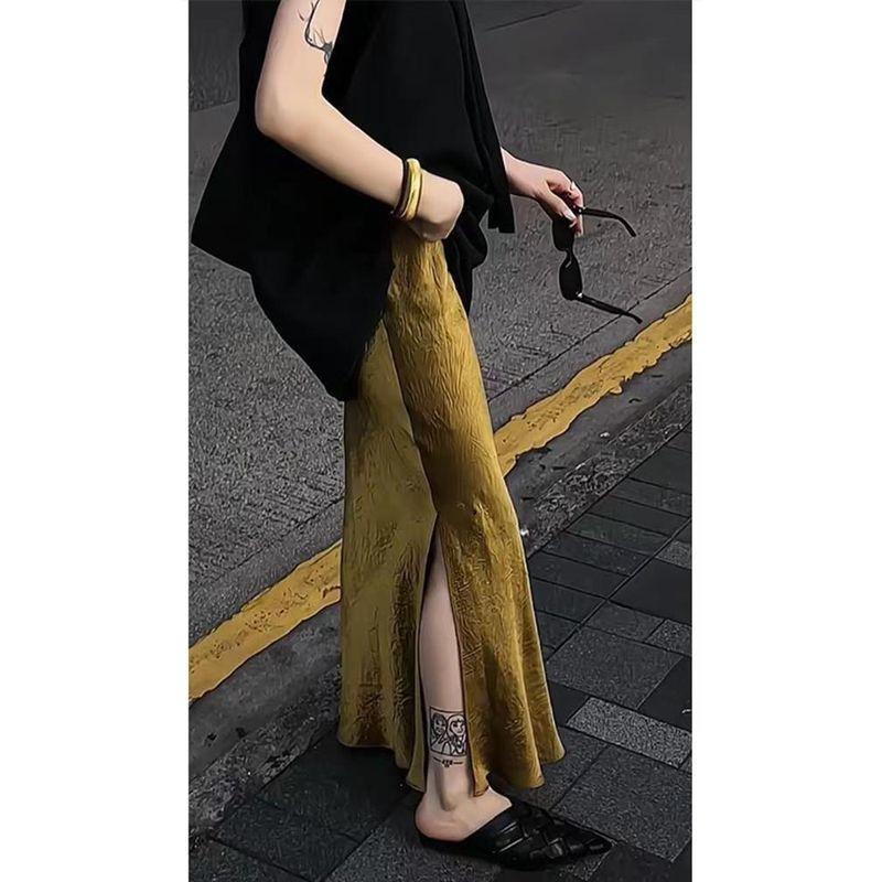 Драпированная атласная юбка Женская стильная маленькая длинная юбка-футляр с разрезом Весна/Лето с высокой талией Прямая юбка-карандаш Gold 3XL