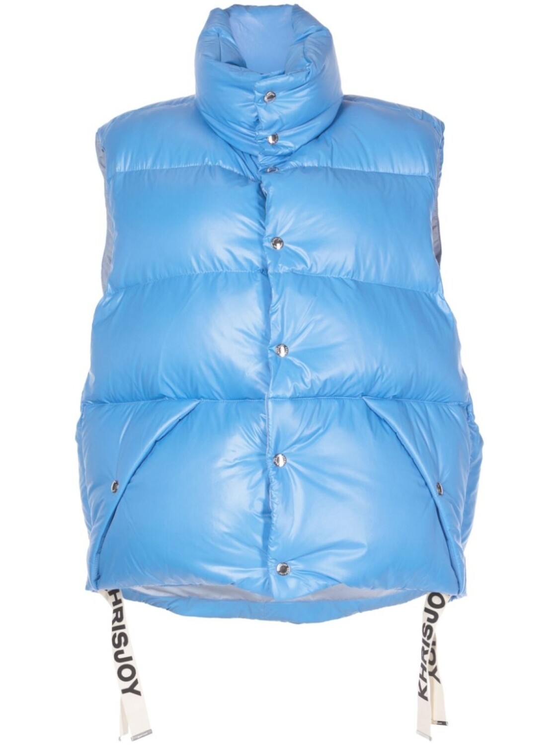 Голубой, наполнитель из смеси пуха и пера, дутый материал, стеганая модель, отделка лентой с логотипом, глянцевая фактура, воротник-труба, застежка на кнопках спереди, два боковых кармана с застежкой на кнопки, без рукавов и неравномерный подол.