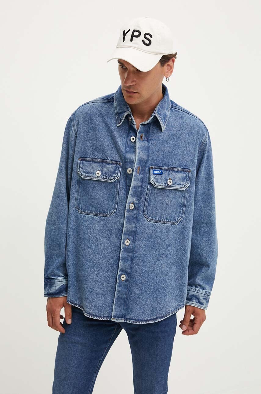 Дънкова риза Hugo Blue мъжка в синьо със свободна кройка с класическа яка, Син