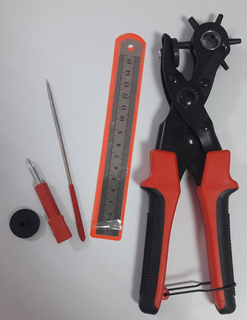 Хорошая комплектация: линейка, напильник, отвертка для замены основания пробойника и сама основа.