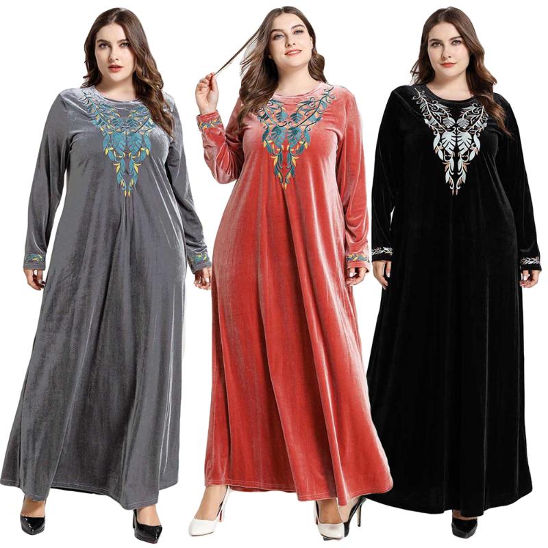 Plus Size Velvet Dress Dubai Muslim Women Abaya Floral Embroidery Long Sleeve Gown Islamic Party Jilbab Kaftan Winter Abaya Robe