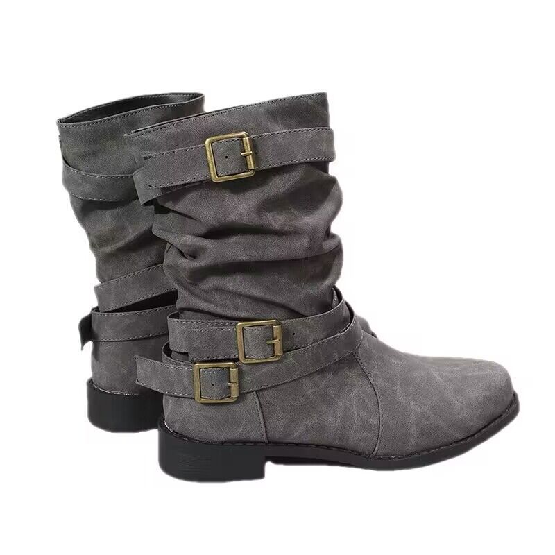 Европейская и американская внешняя торговля больших размеров пряжка ремня низкий каблук рыцарские сапоги женские на танкетке ретро стиль плоские кожаные сапоги 41