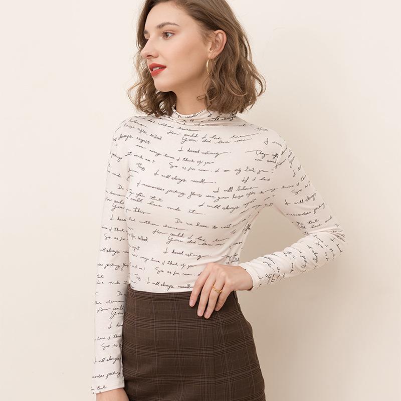 Европейская женская новая тонкая нижняя рубашка с высоким воротом, женская корейская футболка с длинными рукавами и принтом, топ для женщин XXL абрикосовый