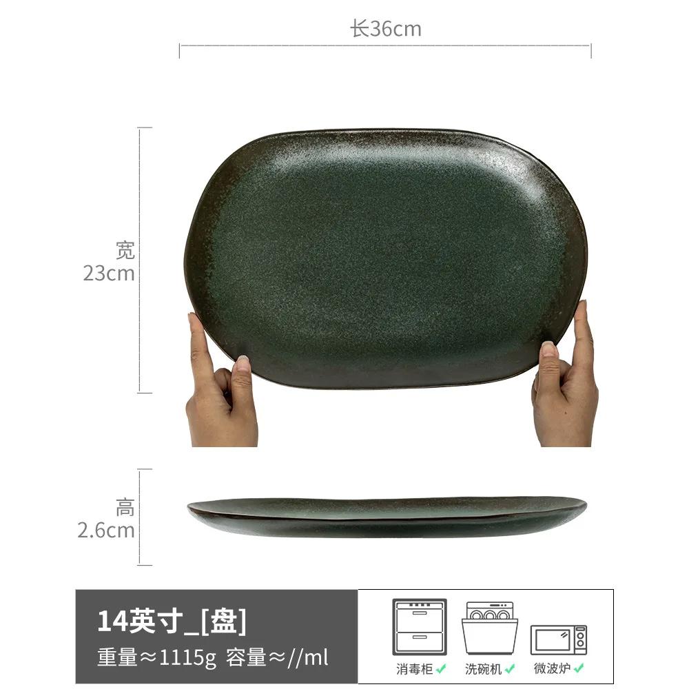 Европейская ретро керамическая овальная тарелка для дома креативная длинная овощная тарелка термостойкая посуда для приготовления рыбы на пару 14 inches темно-зеленого