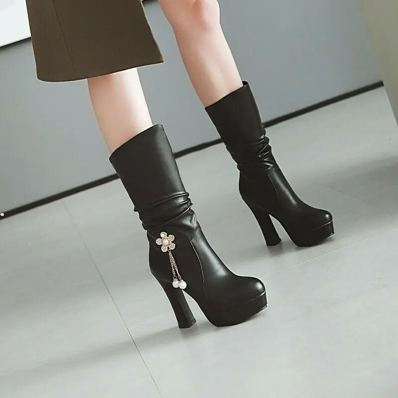 Европейские женские плиссированные сапоги до середины икры на блочном каблуке с круглым носком