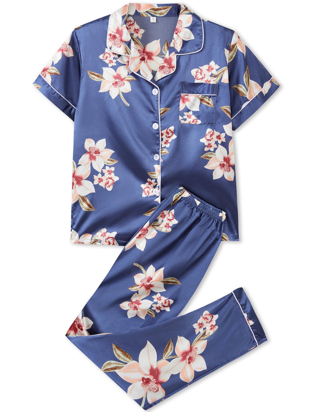 Европейский и американский стиль, женская элегантная домашняя одежда весна-осень, комплект из 2 предметов, короткий рукав, длинные брюки, пижама, модная домашняя одежда с принтом XL темно-синий