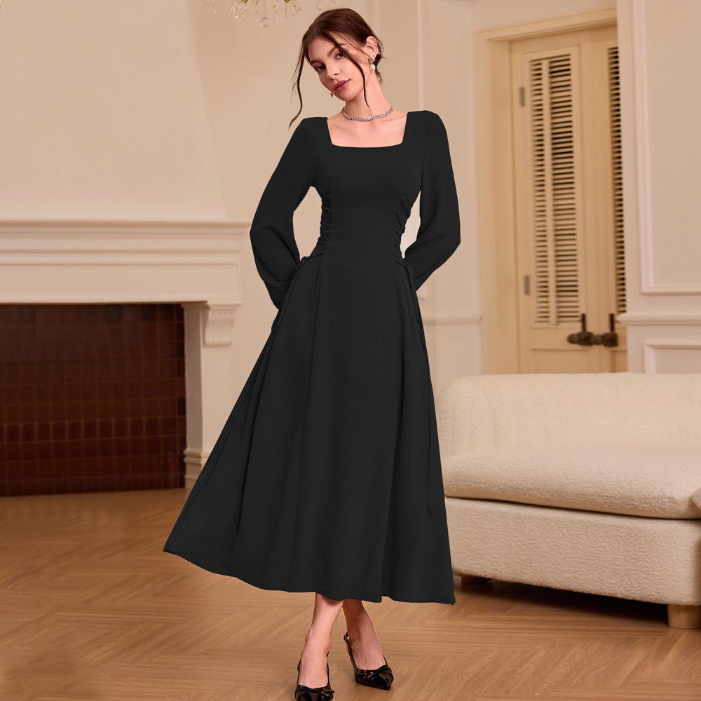 Европейское и американское женское платье винного цвета с французским квадратным вырезом - Ретро осенне-зимний стиль, приталенное и элегантное длинное платье Small чёрный