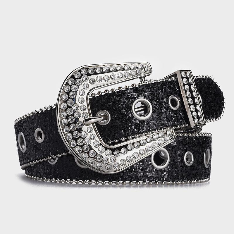 Европейско-американский ремень с пряжкой из стразов: Модный люверс с пайетками, панк-стиль для клубной одежды Length 110 cm, Width 3.8 cm чёрный