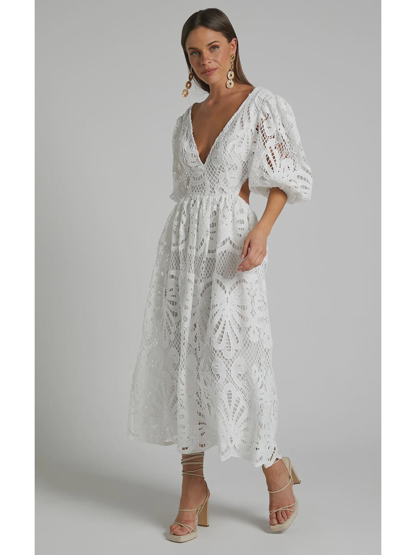 Европейско-американское лето 2025 женское длинное платье с V-образным вырезом и кружевной вышивкой Extra Large белый