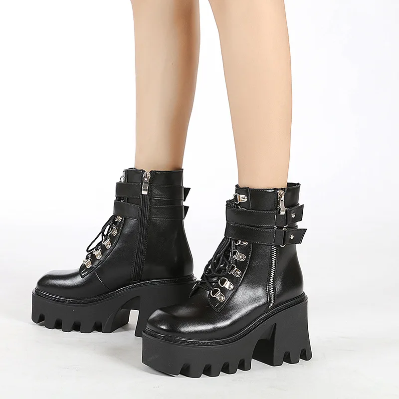 Spring and Autumn Woman Boots Cross-tied Gothic Platform Boots Women Shoes Chunky Heel Black Ankle Boots Girls Punk Style Zippe