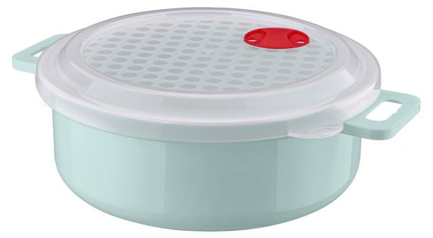 Емкость можно использовать для хранения продуктов в холодильнике, а также для разогревания пищи в микроволновой печи. В микроволновой печи можно использовать, не снимая крышки (при открытом клапане), что ускоряет процесс и предохраняет внутреннюю поверхность микроволновой печи от загрязнения. Клапан для выпуска пара имеет два положения: открыт/закрыт. Емкость имеет удобные ручки. Можно использовать только для разогревания, заморозки до -24°С, можно мыть в посудомоечной машине. Материал: полипропилен. Цвет: светло-голубой. Размеры: 19х19х8 см.