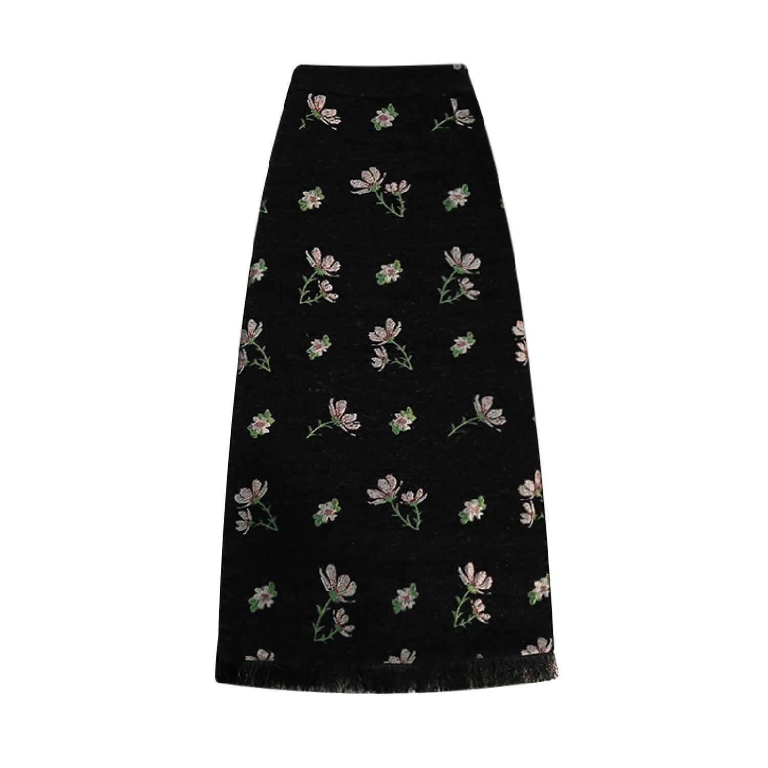 Жаккардовая черная юбка для женщин зимой, юбка А-силуэта с высокой талией и разрезом средней длины, которая делает их стройнее, и прямая юбка с кисточками XL
