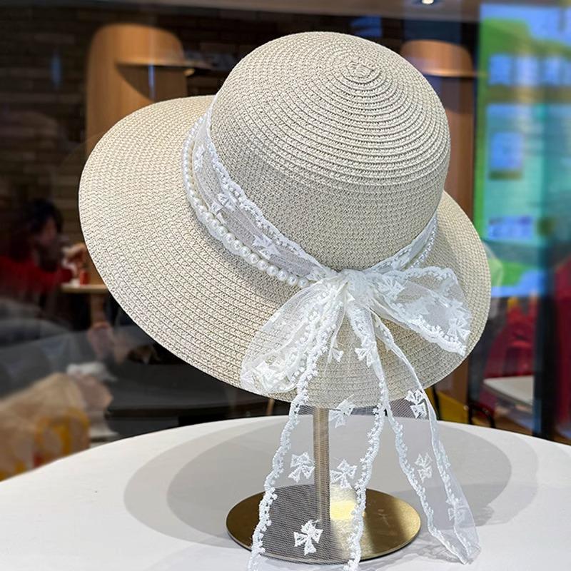 Жемчужное кружево бант соломенная шляпа женская новая летняя приморская пляжная соломенная отпуск ветрозащитная солнцезащитная шляпа бежевый