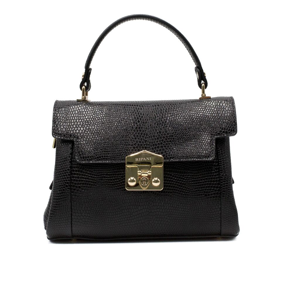 Женская сумка Ripani черного цвета с тиснением, выполнена из натуральной кожи. Сумку можно носить как на плече, так и в руке. Сумка закрывается на замок, внутри сумки три отделения, два из которых открытые и одно отделение на молнии, есть два кармана для различной мелочи, телефона и документов. Высота ручки – 11см, высота сумки – 18см, ширина – 14см, длина – 23см, длина плечевого ремня – 121см(регулируется). Стиль и дизайн сумки уникален и неповторим, приобретая такую незаменимую деталь вашего образа вы будете в восторге от обладания сумкой.