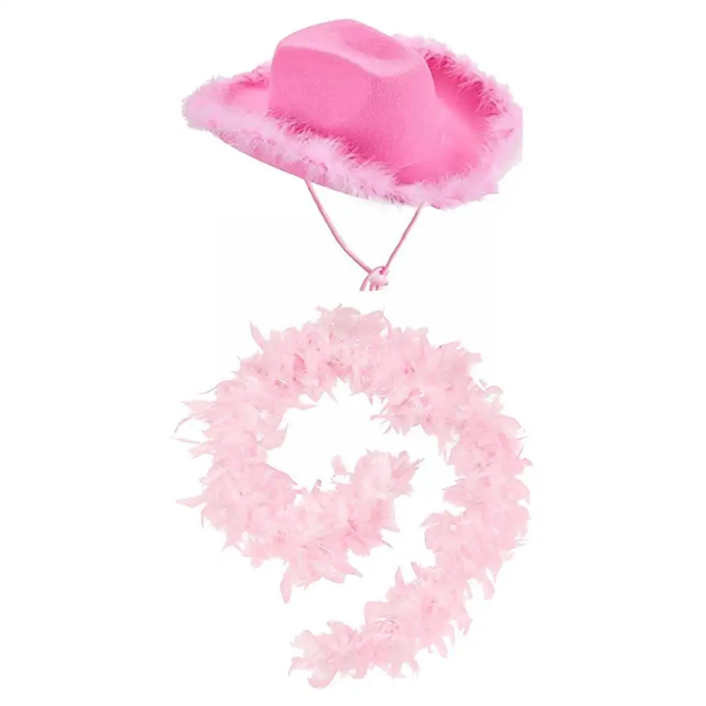 Женская Ковбойская шляпа с розовыми перьями, ковбойская шляпа в западном стиле с пушистыми хорошими, ковбойская шляпа с перьями, шляпа боа, ковбойская шляпа для девичника Q3M6
