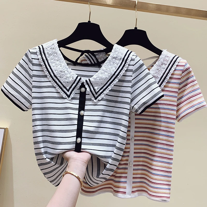 Женская Кружевная футболка, белая футболка с отложным воротником и пуговицами, с коротким рукавом, лето 2021