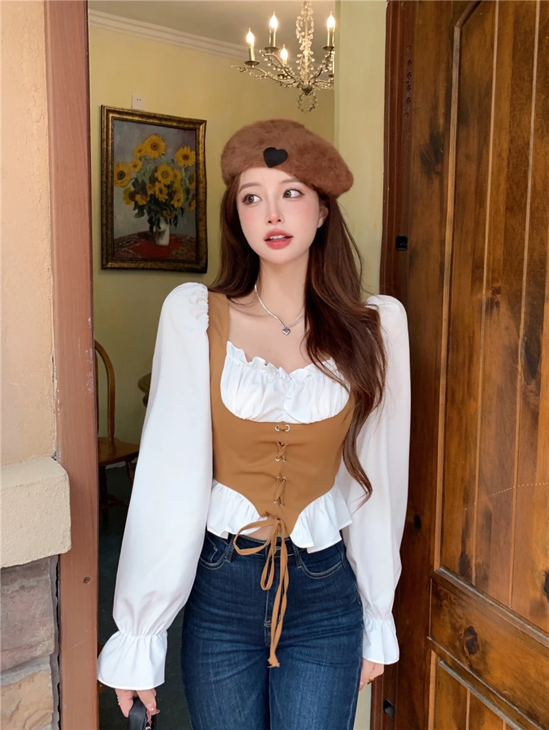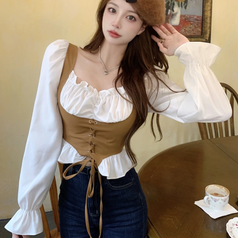 Женская Облегающая рубашка с длинным рукавом и квадратным воротником, в стиле Харадзюку