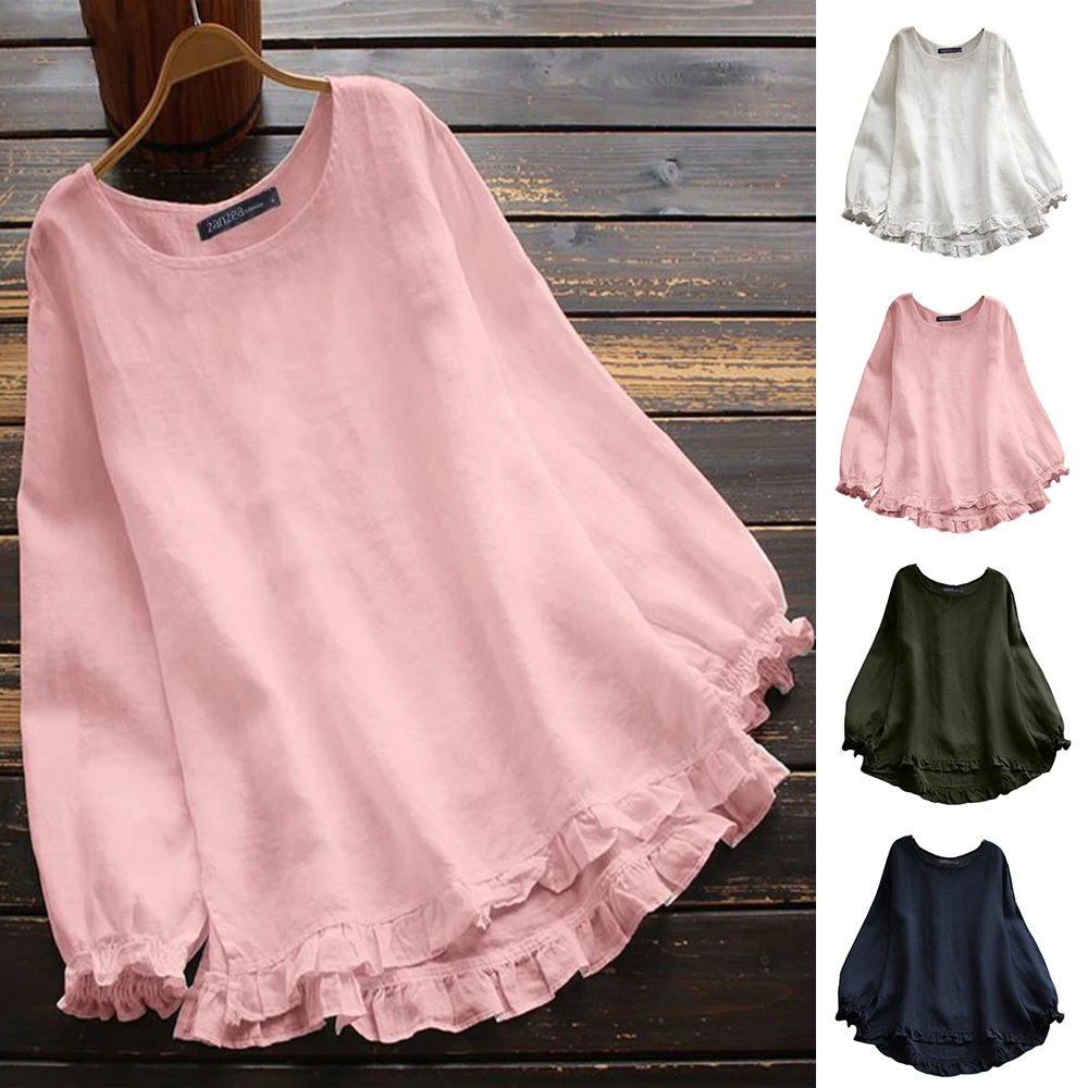 Женская Однотонная футболка с рюшами и длинным рукавом, осенняя Повседневная свободная туника, топы с круглым вырезом, однотонная блузка с ...
