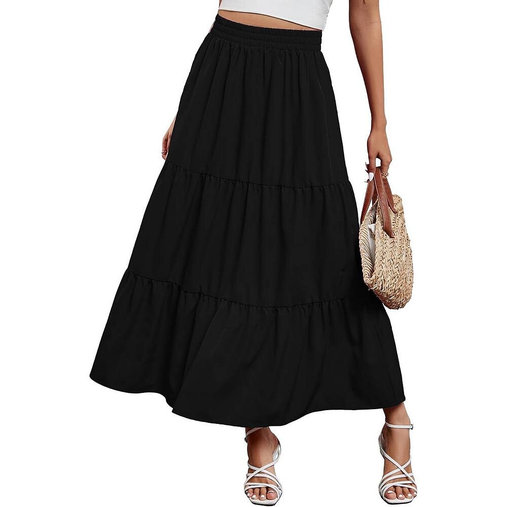 Женская макси-юбка в стиле бохо с эластичной высокой талией плиссированной трапециевидной формы с струящимися рюшами и многоуровневой длинной пляжной юбкой MISSKY, черный