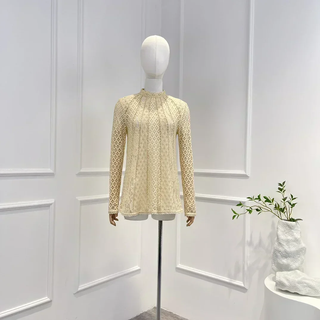 Женская ажурная блузка с длинным рукавом, однотонная универсальная Элегантная блузка, новинка 2023