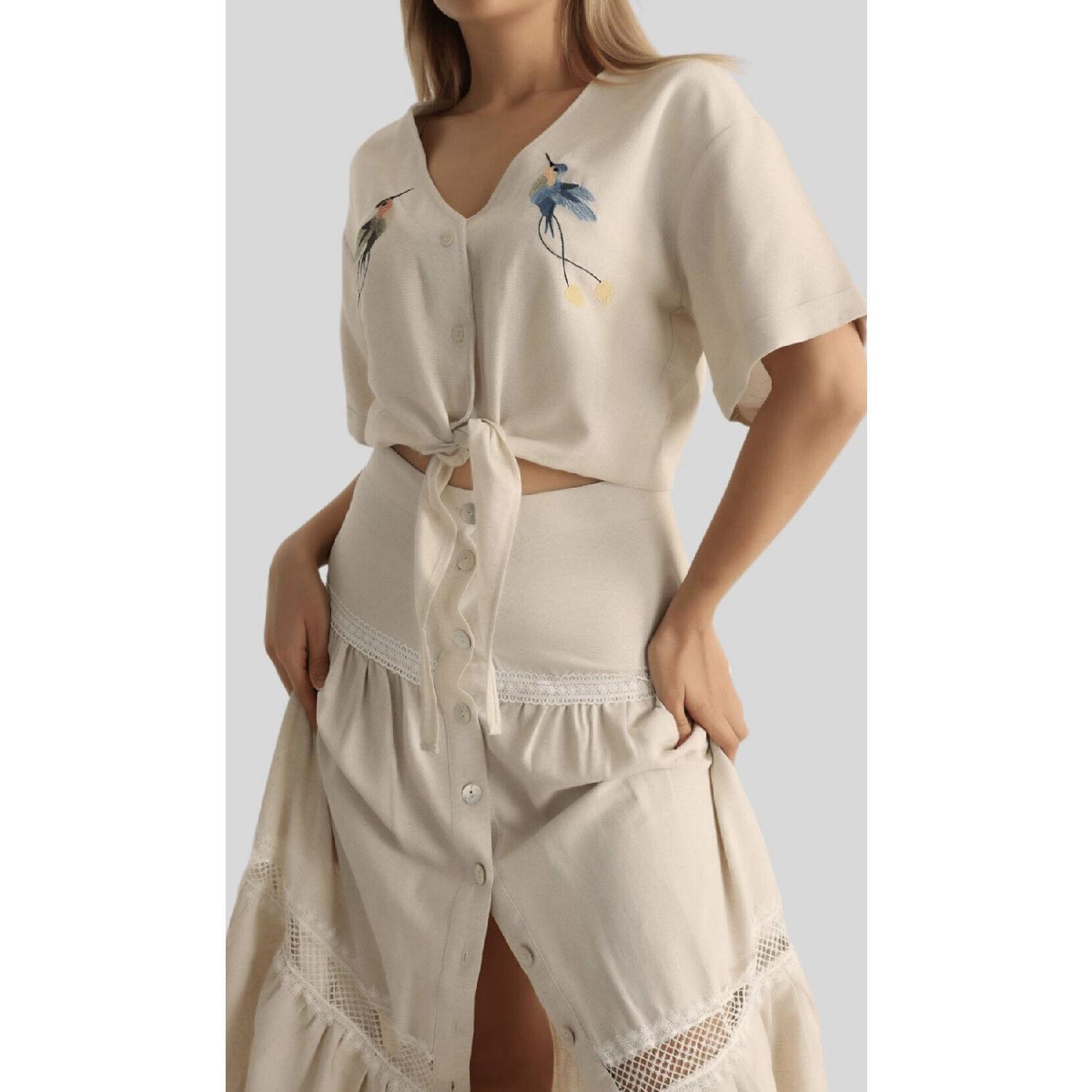 Женская бежевая льняная рубашка с вышивкой птиц и завязкой спереди S