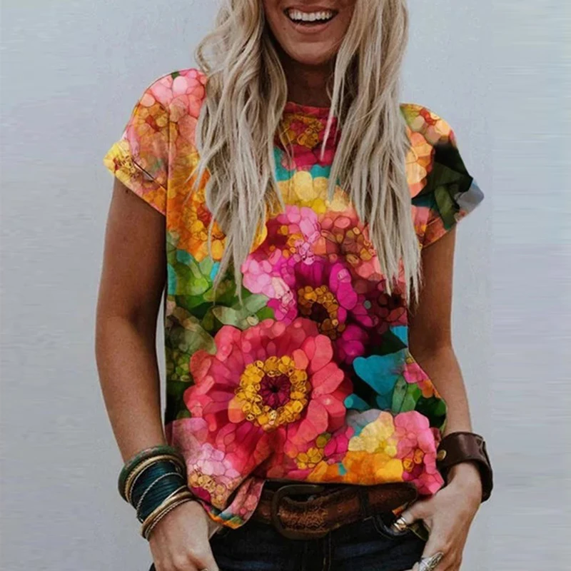Женская блуза с цветочным принтом, коротким рукавом и круглым вырезом